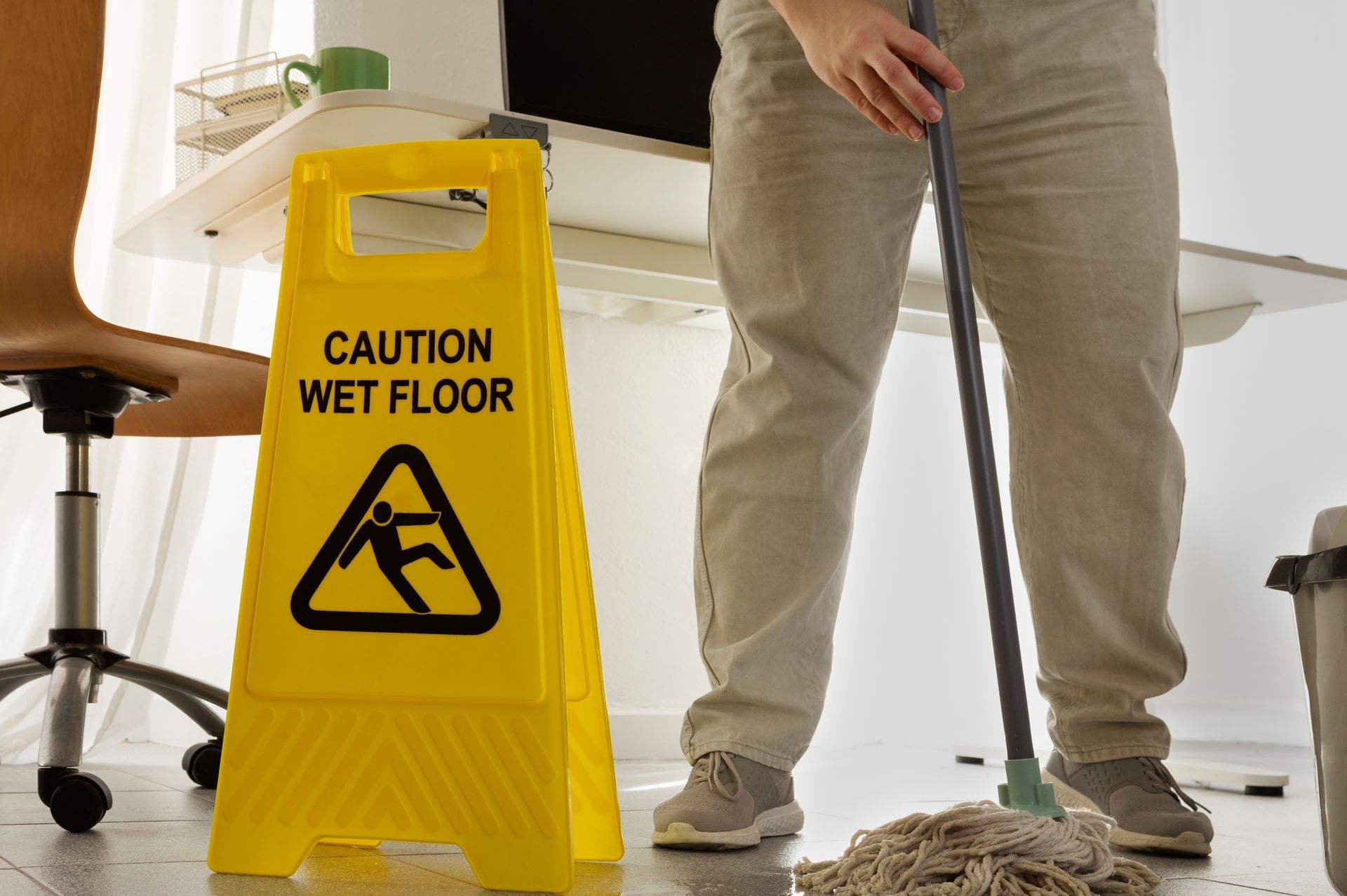 Spilled liquids, recently mopped floors, or icy walkways without warning sig